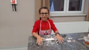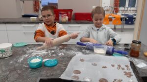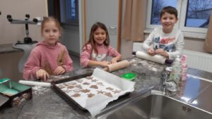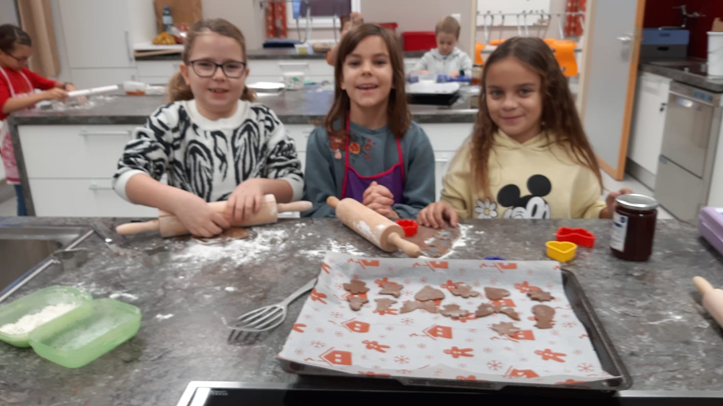 Sichtlich Spaß hatten die Schüler und Schülerinnen der Volksschule beim Backen verschiedener Weihnachtsbäckerei in der Küche der Mittelschule.