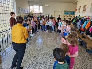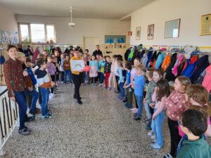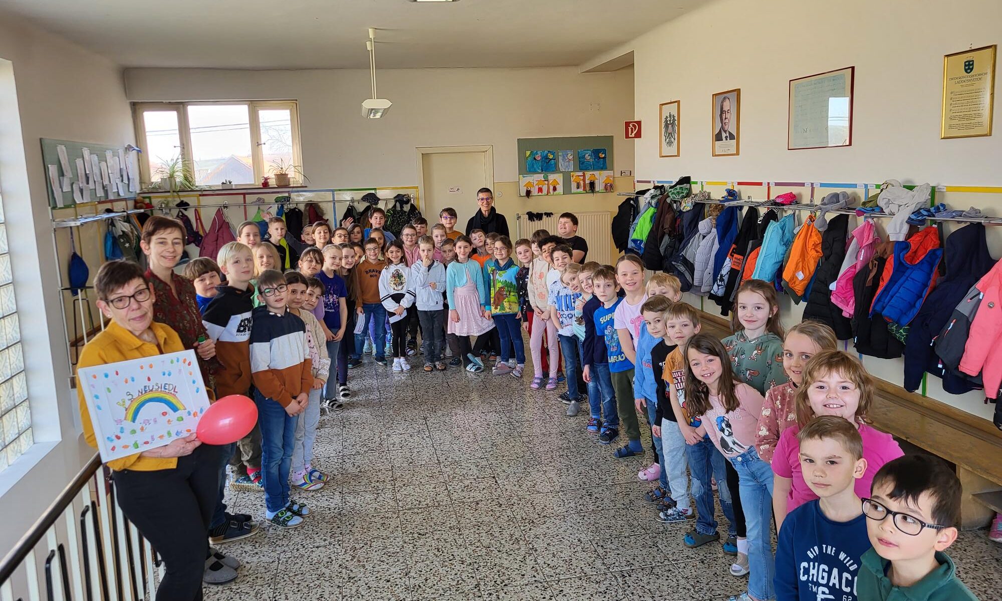 Mit einem Gedicht und einem Lied wünschten ihr die Schülerinnen, Schüler und Kolleginnen nur das Beste. Ein Regenbogen soll sie immer an die Zeit in der Volksschule Neusiedl erinnern.