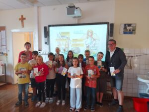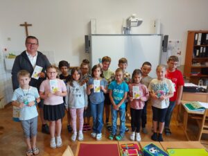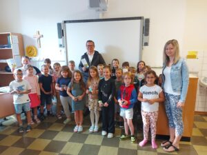 Bürgermeister Andreas Keller überbrachte im Zuge der Aktion Schutzengel kleine Geschenke der Landeshauptfrau. Die Initiative möchte sowohl Autofahrerinnen und Autofahrer als auch Schulkinder auf das richtige Verhalten am Schulweg hinweisen.