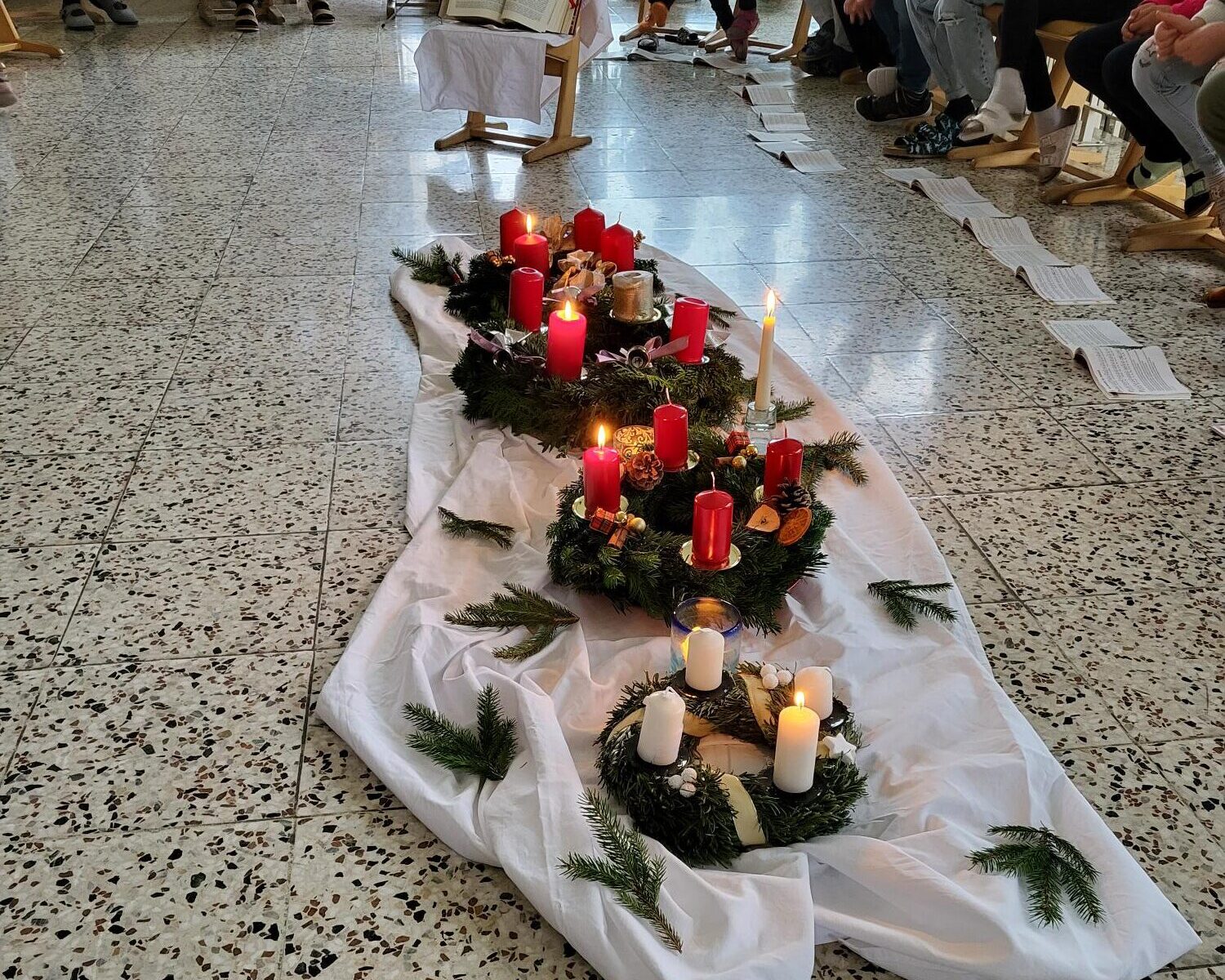 Rechtzeitig vor dem ersten Adventsonntag wurden die Adventkränze der drei Klassen und der Nachmittagsbetreuungsgruppe von Pfarrer Tadeusz Krupnik gesegnet.