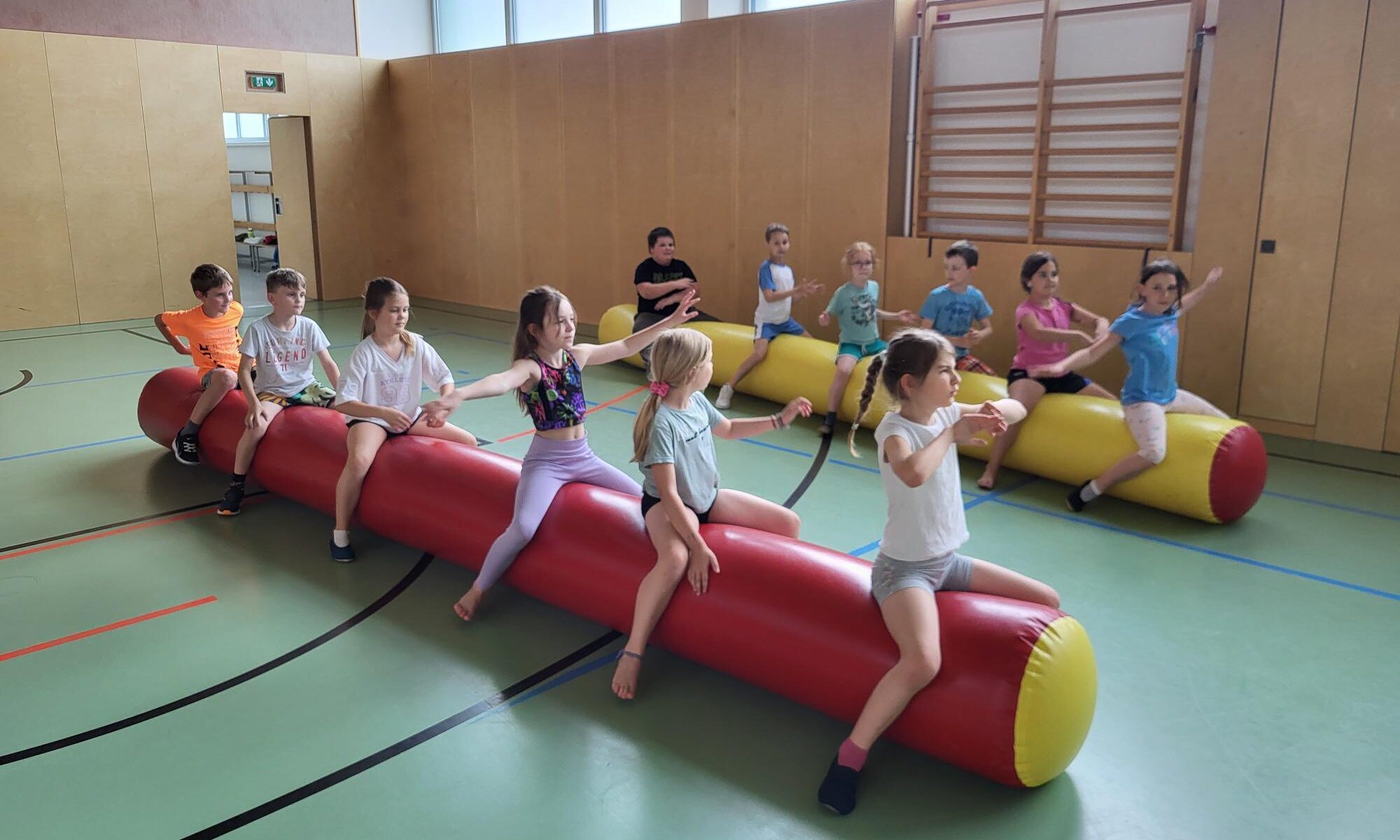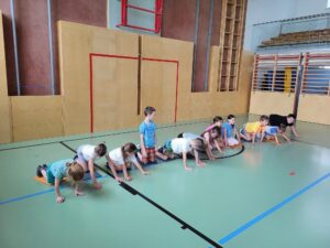 Im Schuljahr 2023/24 besuchte uns im Rahmen des Projekts „Kinder gesund bewegen“ eine Turntrainerin mit dem Maskottchen „Hopsi Hopper“ in einigen Turnstunden. Das fleißige Mitmachen der Schülerinnen und Schüler wurde mit einem Sticker belohnt.