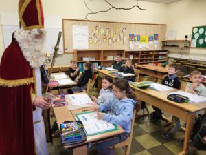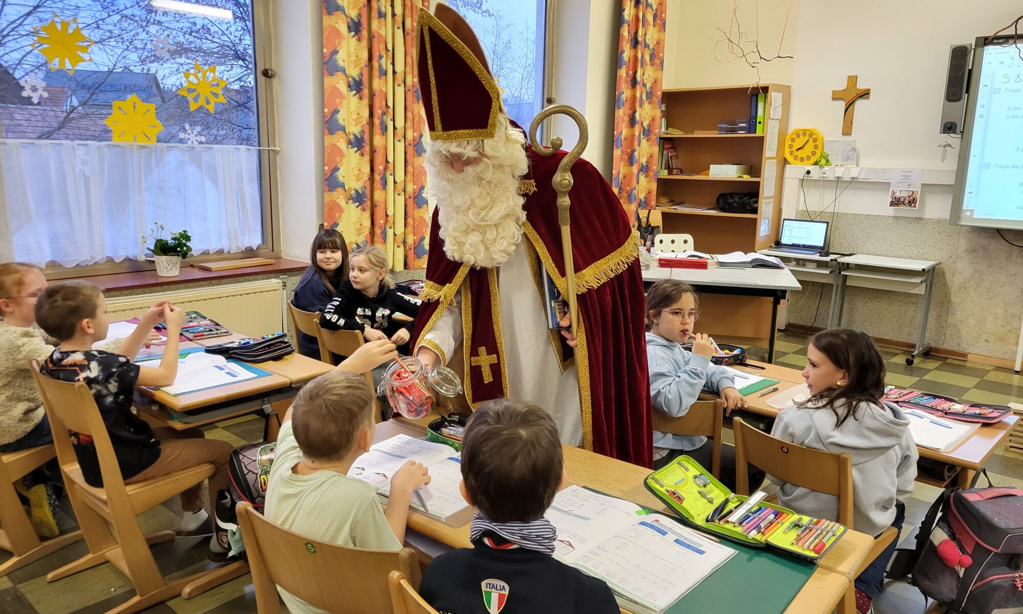 Auf seinem Weg zu den braven Kindern machte der Nikolaus Halt bei uns in der Volksschule und überbrachte den Schülerinnen und Schülern Schokolade-Nikoläuse.