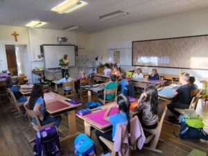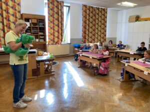 Bereits in der dritten Schulwoche kam die Zahngesundheitserzieherin mit ihrem Maskottchen „Kroko“ zu uns an die Schule. Gemeinsam brachten sie unseren Schülern und Schülerinnen die richtige Zahnputztechnik bei.